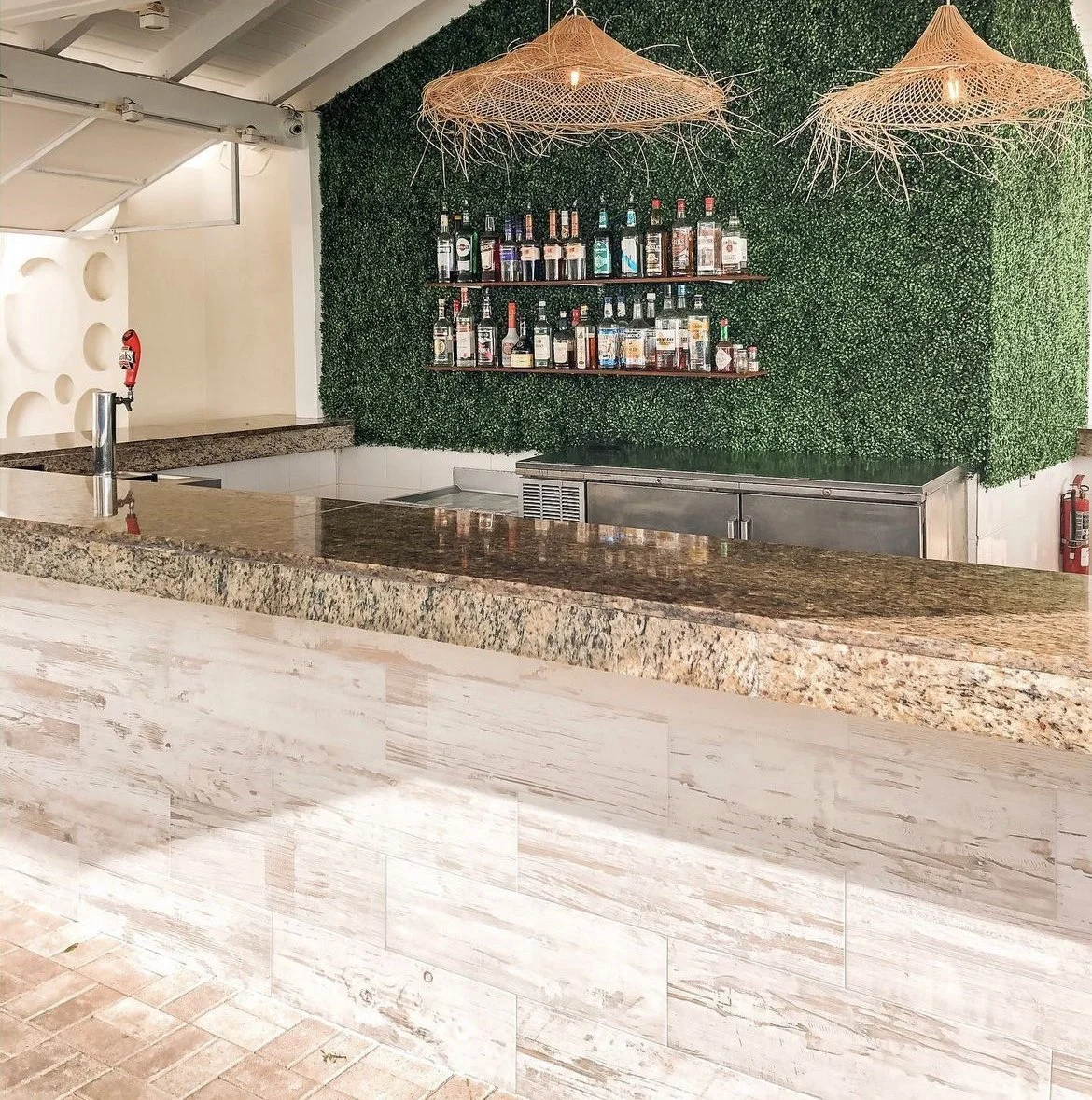 A boutique hotel which prides itself as the epitome of laid-back luxury needed a simple, fast but effective re-design for their pool & seaside bar. Creating a lighter atmosphere with this faux whitewashed tile and adding natural textures soften the space as well as add character. Increasing functionality was also very important and can be seen with the addition of overhead lights and display shelving for the alcohol, creating workspace for the bartender below.