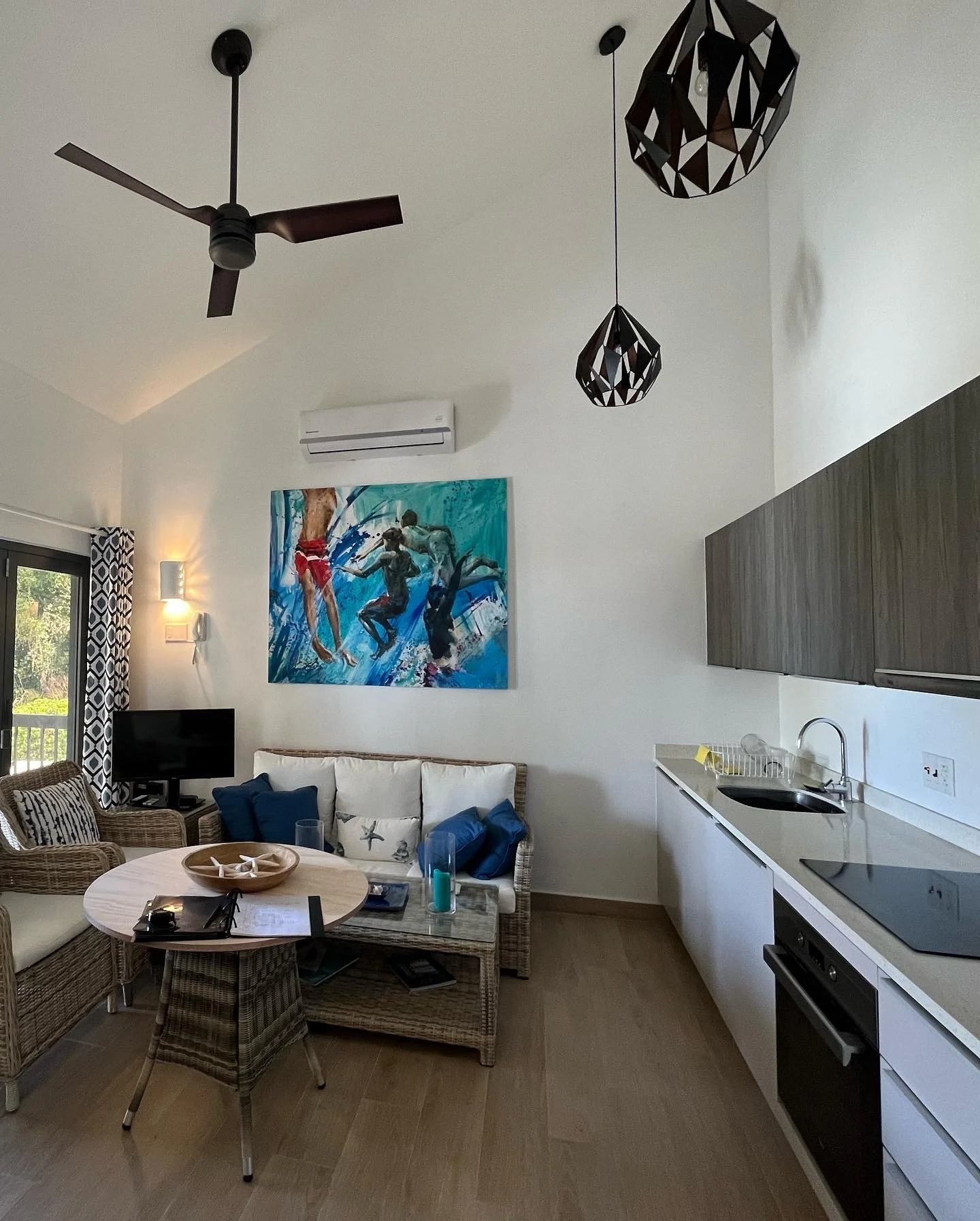 I loved designing around the clients’ personal photos and artwork, they became an integral part of the inspiration regarding color palette and textures. For example, the black and white photos stood out so beautifully against the grey slat wall and the custom designed rattan headboard brought out another traditional Bajan element as seen in the photos.